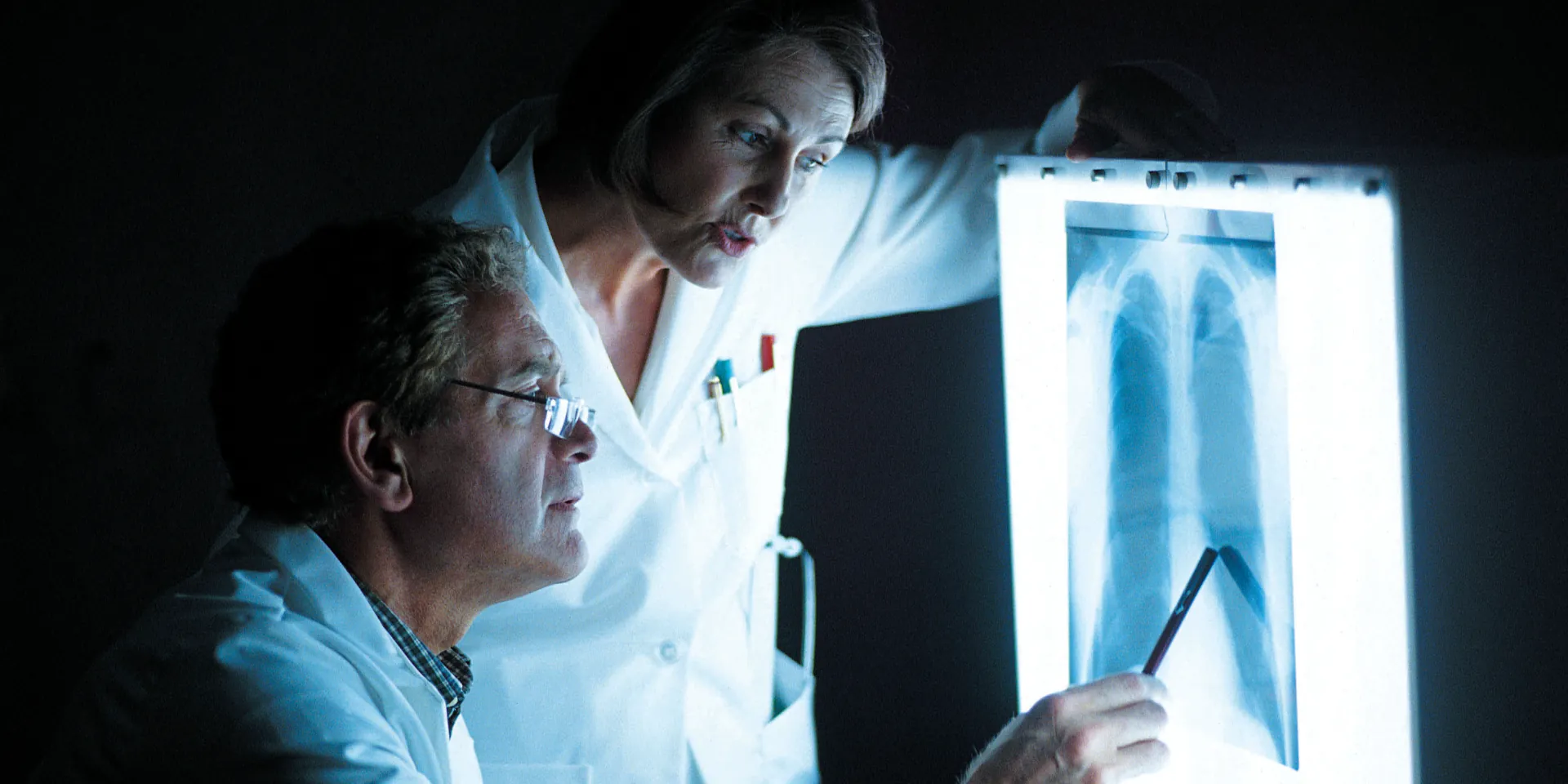 Médico grisalho avaliando raio-x de tórax